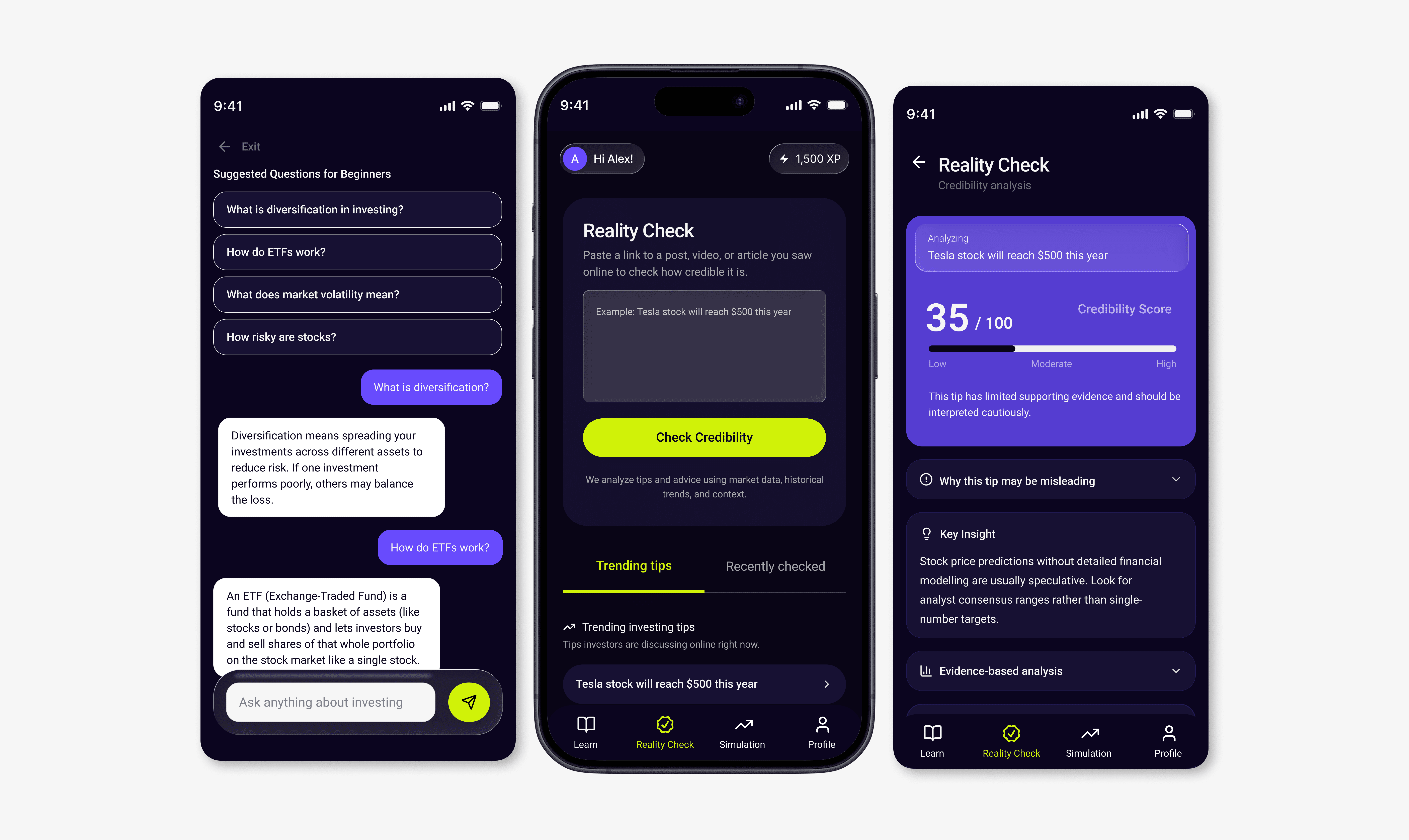Users loved the quizzes after each lesson — but expected more varied learning formats. The simulation worked well in principle, but beginners weren't sure what to do once they arrived there. The Reality Check credibility score landed well, but the explanation felt too long.