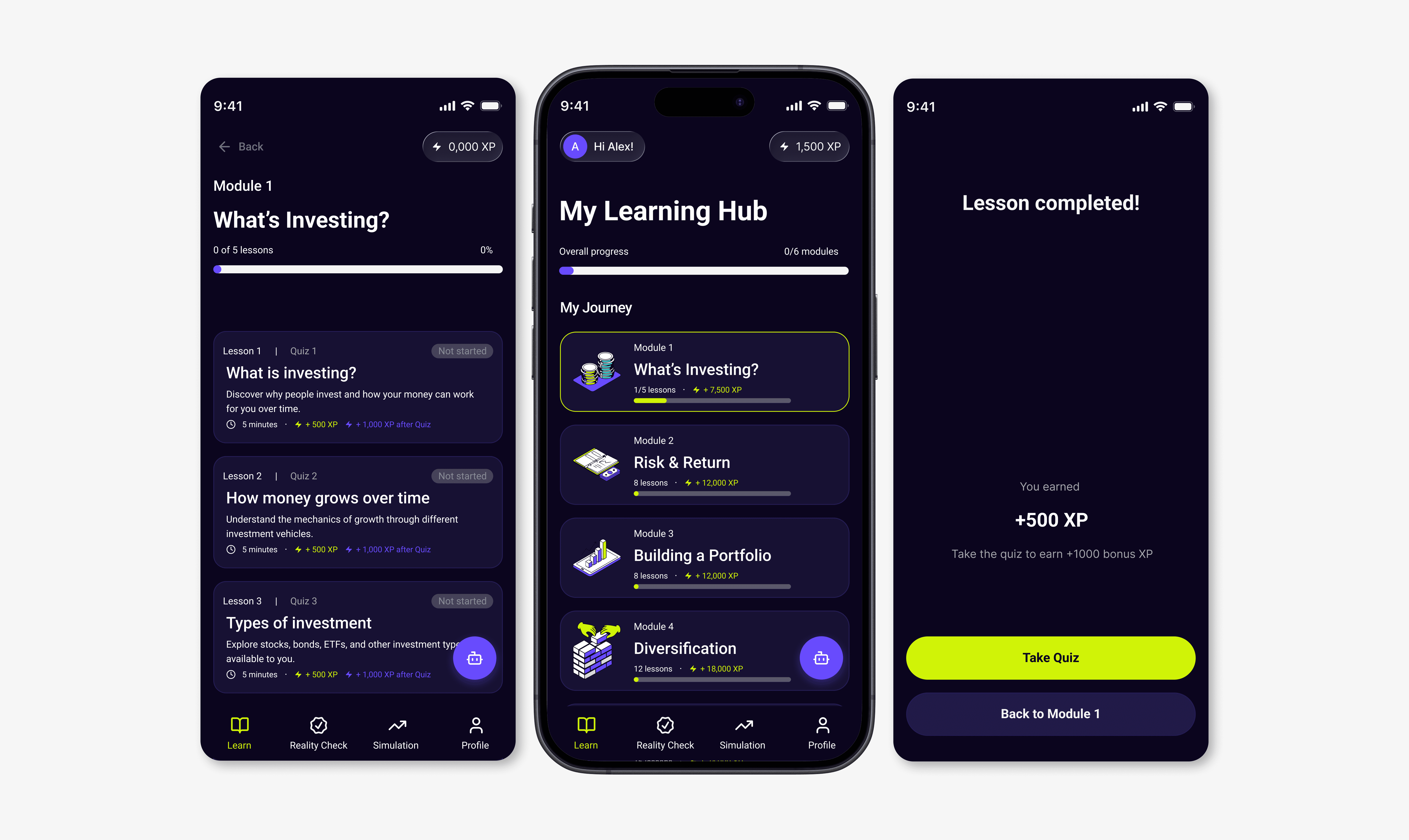 Users move through structured lessons, earn XP by completing quizzes, and turn those rewards into virtual money that can be used inside the Simulation Sandbox.This allows beginners to experiment, make mistakes, and learn without real financial risk.