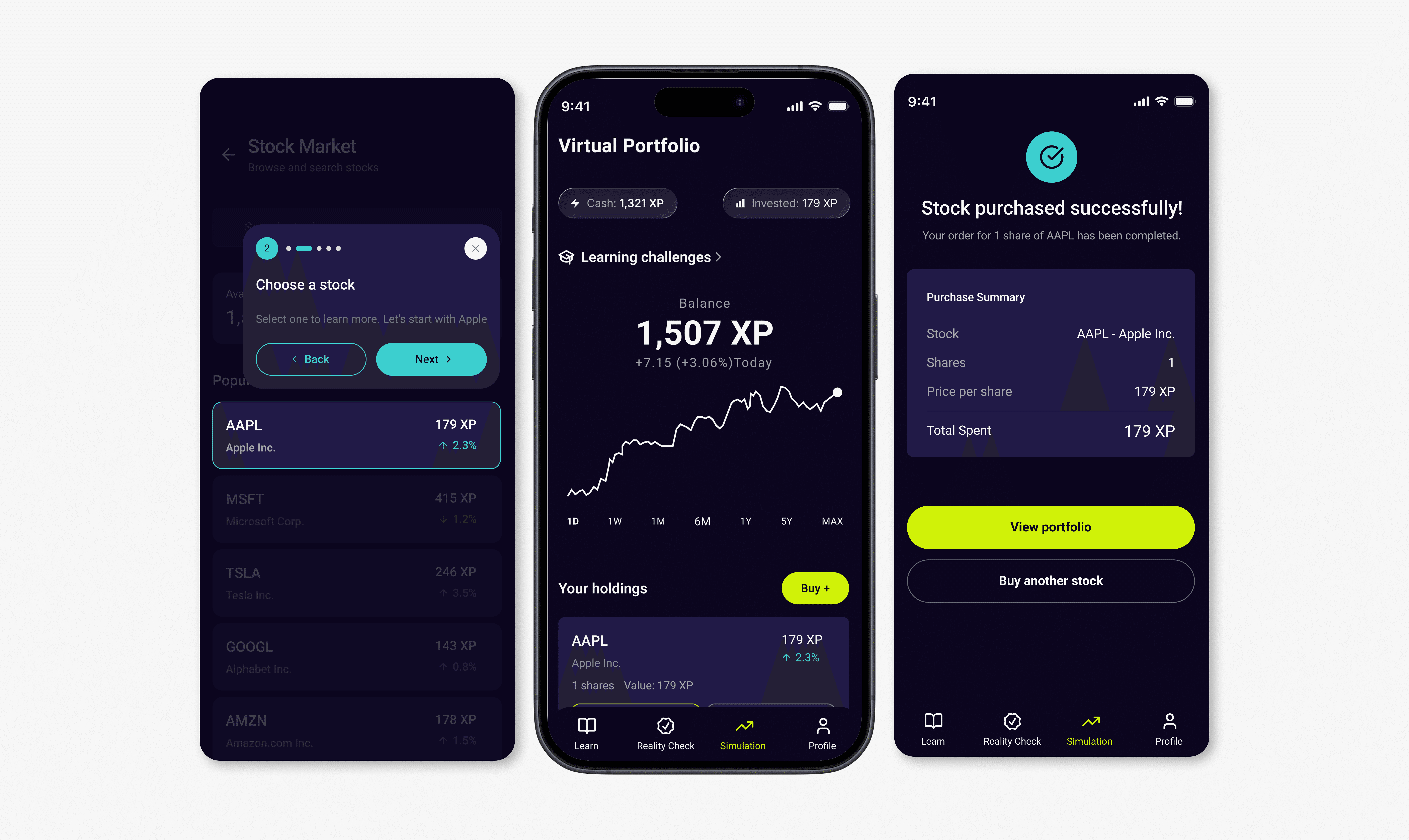 | SIMULATION SANDBOX — A safe environment to practice investing with virtual money before touching real funds. This directly addressed the fear of making mistakes that 5 out of 6 interviewees described. You can't build confidence without practice, and practice shouldn't cost you anything.
